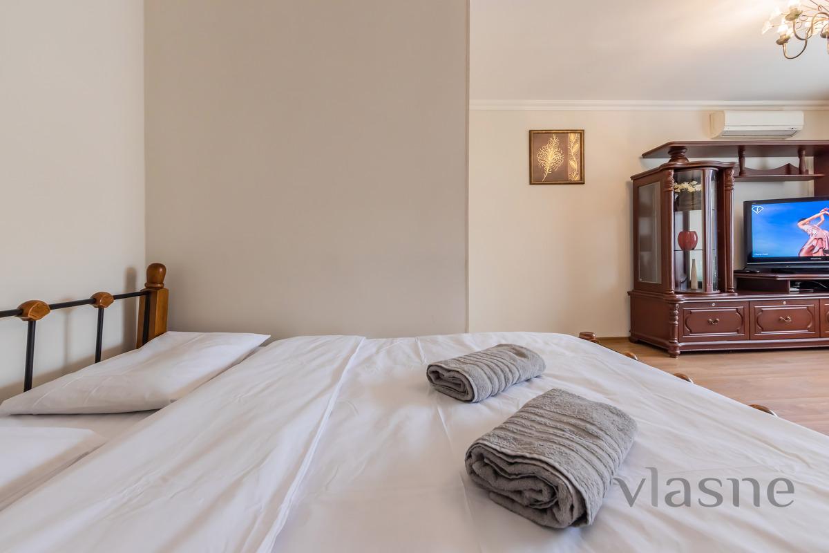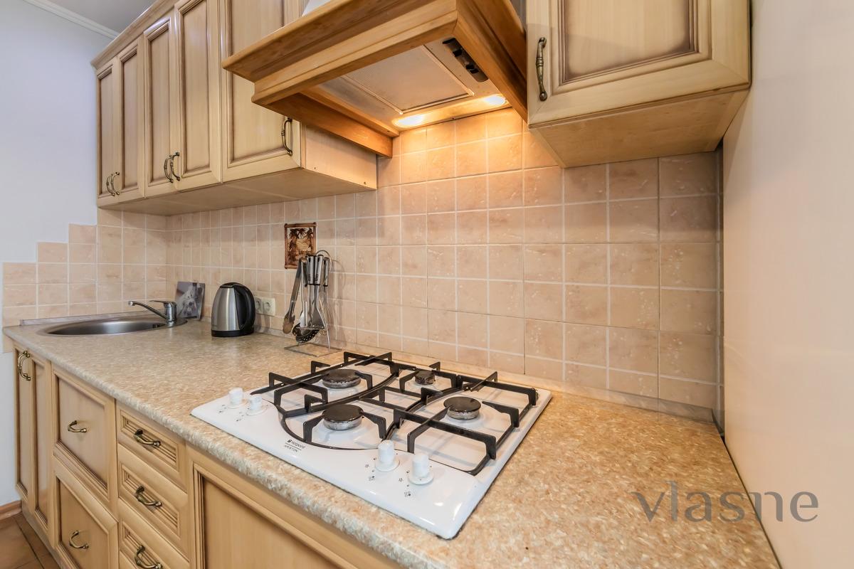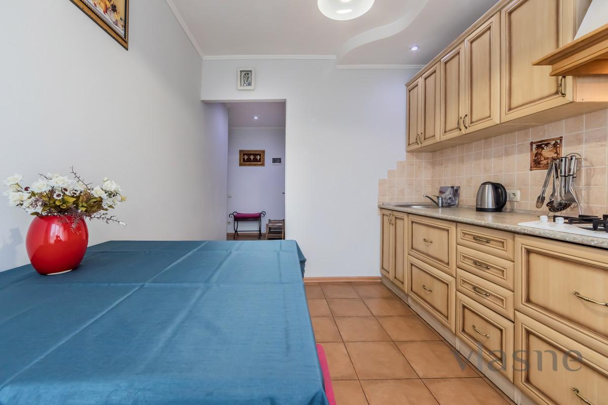 For 13th century While walking you can look at the monument “Khreschatyk metro station”. Regular guests have free Wi-Fi throughout the entire premises. The room is furnished with a double bed and 2 armchairs, as well as a coffee table, a sideboard and a wall-mounted plasma TV. For the comfort of guests, air conditioning is installed. The kitchen is equipped with kitchen appliances and household appliances: - micro-hair stove; - fridge; - gas stove with hood; - electric kettle; - fridge. The bathroom has a large Jacuzzi, a sink with a mirror, a washing machine and a boiler. Guests are always provided with fresh, white linens and clean towels. Please check the availability of your rental at the weekend using the phone number. Shvidko, without a turbo, book an apartment!