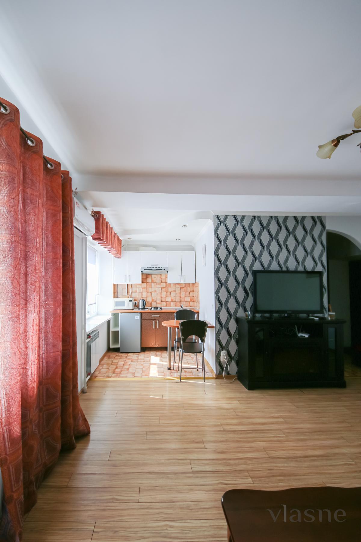 Bright Wikonian apartments have light colors and wooden furniture. At the front of the room there is a large wardrobe with a mirror for special speeches. The kitchen area is equipped with a set of wooden elements, a worktop and a wooden sink. In addition to all the necessary kitchen appliances, there are household appliances: refrigerator, stove, hood, microwave oven and kettle. The handle is placed on a living table with side tables. The bedroom has everything you need for a comfortable stay: a double bed with an orthopedic mattress, bedside tables, a chest of drawers with a TV, a coffee table and armchairs. The bathroom in the room is equipped with a shower cabin, and also has a sink, a wall-mounted mirror and a boiler. Obviously, fresh linen, clean towels and good hygiene. Book by phone 24/7!