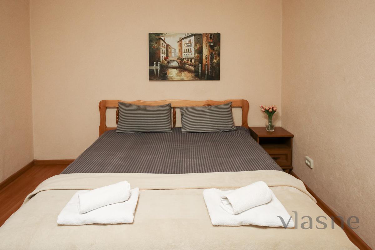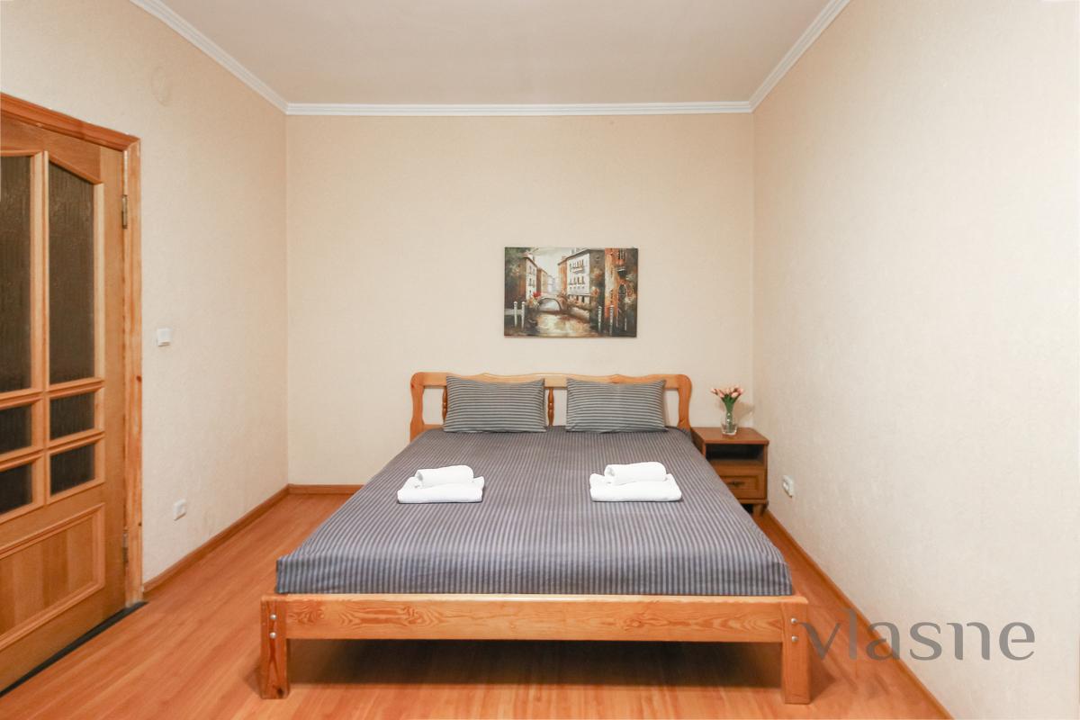 The apartments are located at the address: st. Hospitalna, 2 near the Palats Sportu metro station. Metro Roztashovane is an 8-minute walk (600 m). You have easy access to: restaurants, bars, cafés and the ATB supermarket. There are several convenient places for entertainment nearby: Guliver shopping center, Pinchuk Art Center, Budynok Cinema and park named after Bogomolets.