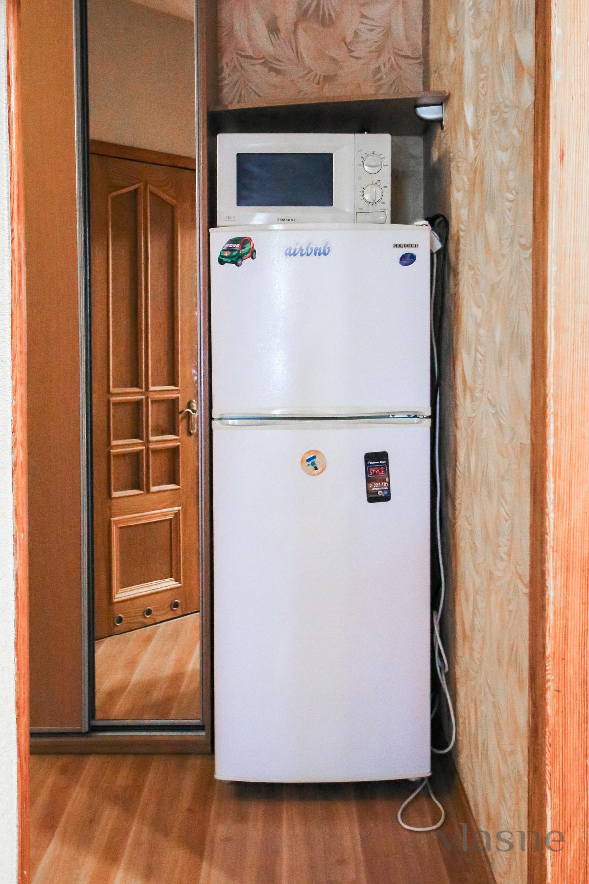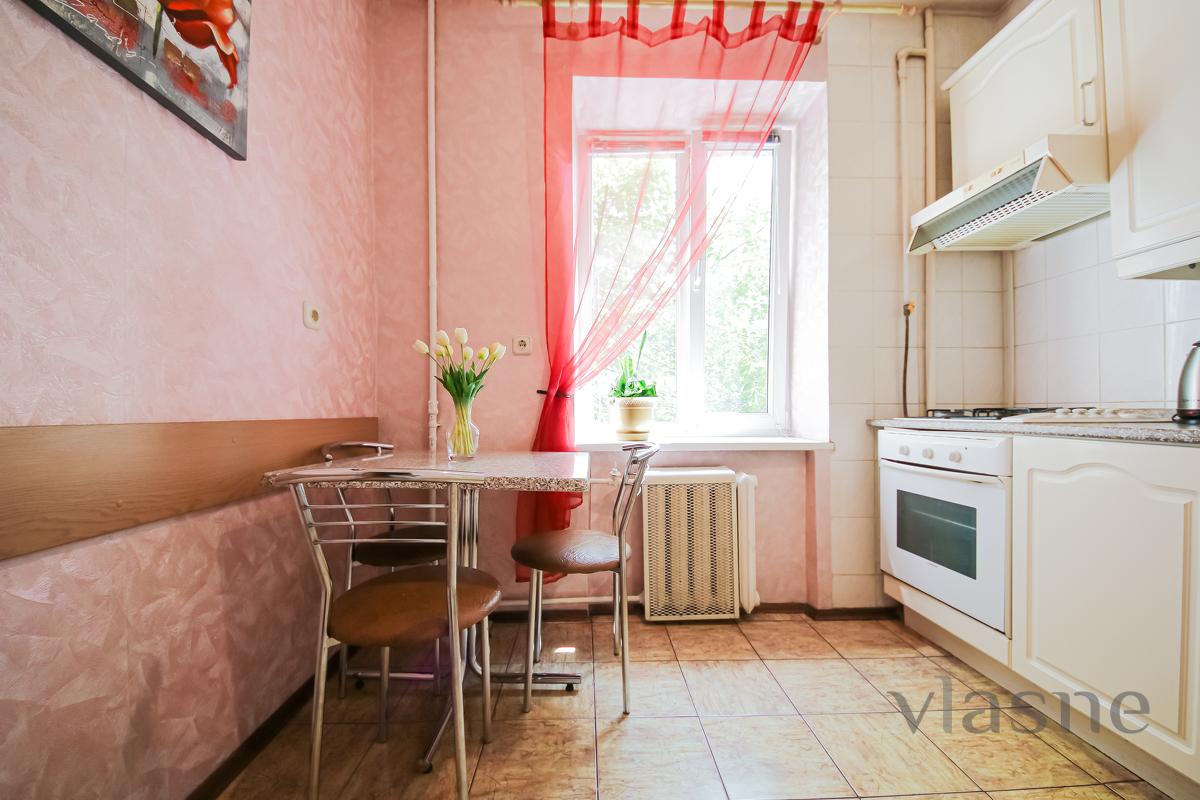 The apartments are neat and quiet, decorated in light shades of different colors. In front of the light-yellow shade, there is a mirrored wardrobe and a wall hanging for placing special speeches. The kitchen is decorated in cream and peach colors, the kitchen set is in a milky color, and there are also tables and chairs for catching hedgehogs. Є all household appliances for comfortable living: refrigerator, stove, oven, hood, refrigerator and kettle. The bedroom is painted in a warm shade of beige. In the middle there is all the necessary furniture and equipment for the reception: a double bed with a comfortable mattress, a bedside table, a sofa, a coffee table, a cabinet with a TV and a wooden stand with shelves for placing special speeches and air conditioner WI-FI provided for access. The bathroom is combined with a toilet and is decorated in light beige tiles. In the middle there is a bath, a toilet, a washbasin with a mirror, a boiler, a washing machine and a hairdryer.