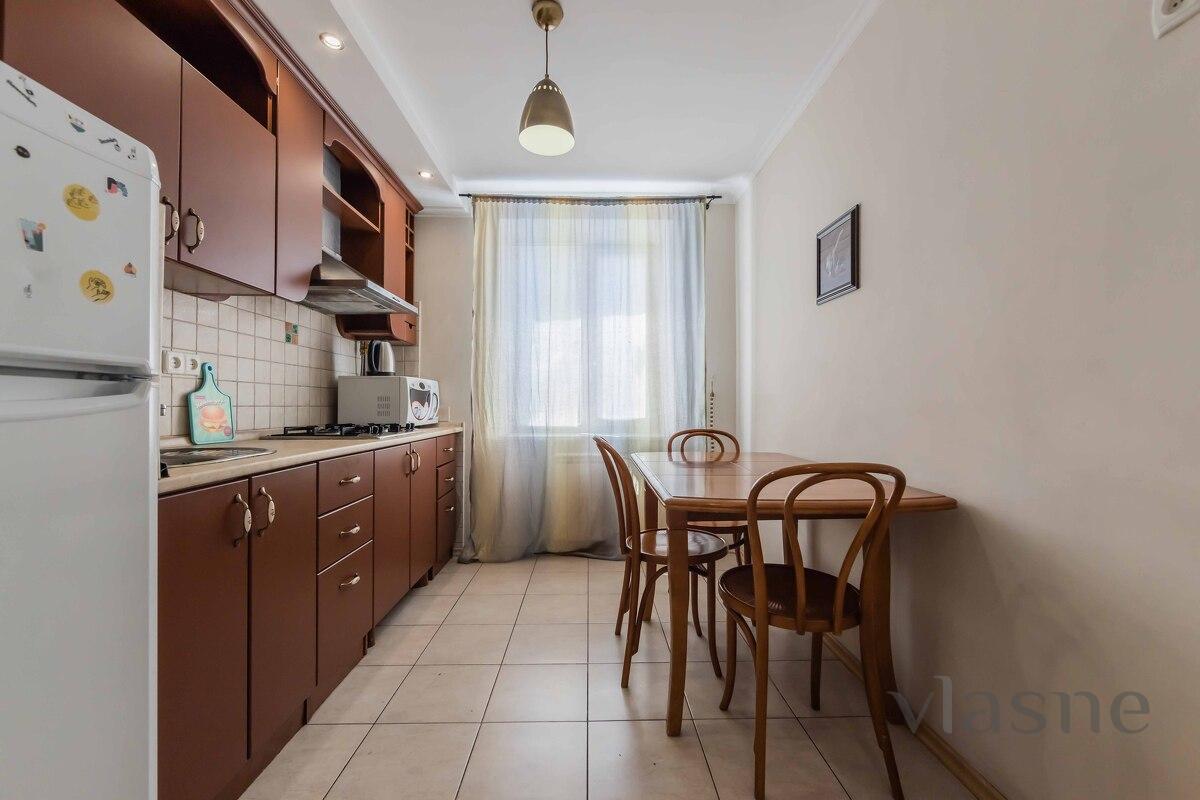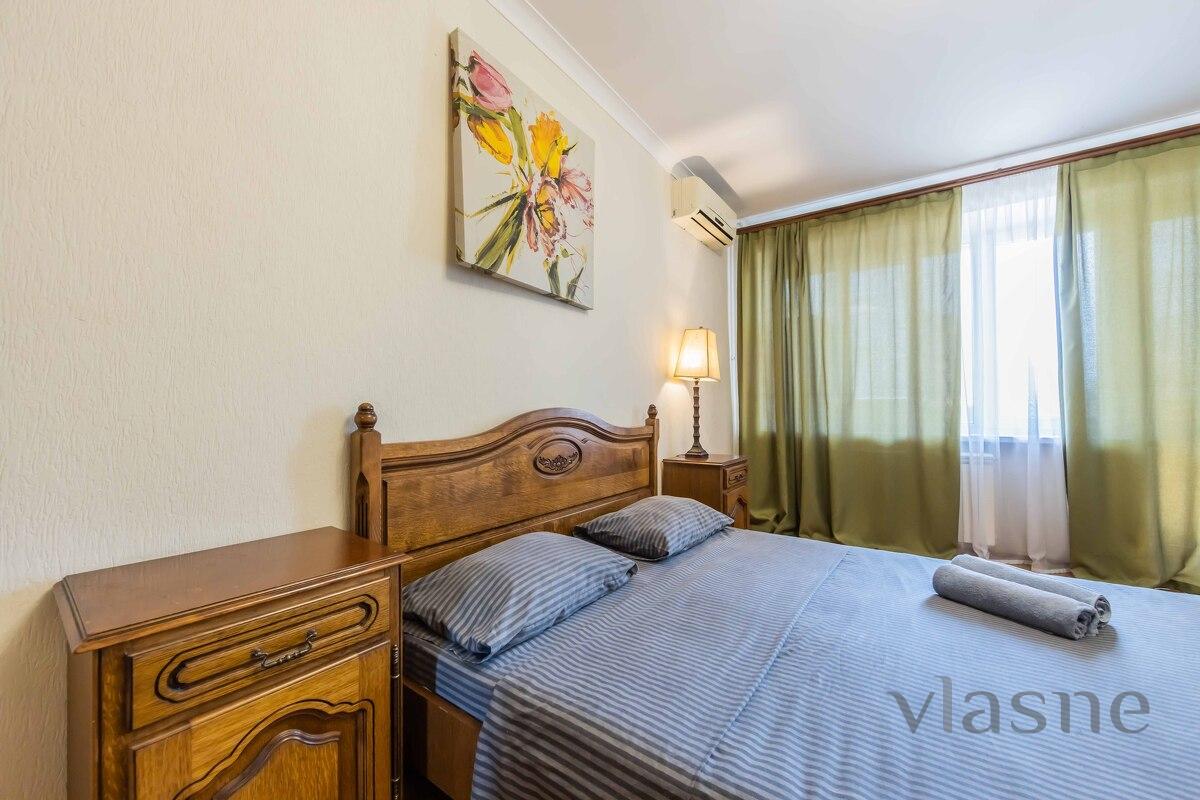 The apartment is located in a prestigious area of Kiev at the address: st. Baseina, 11, order from the Palats Sportu metro station. The spacious and bright apartment, designed in a classic style with retro elements, creates an atmosphere of tranquility and comfort. In addition to the business center, the Guliver shopping center, there are a large number of cafes and restaurants for any taste.