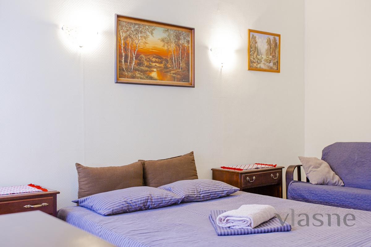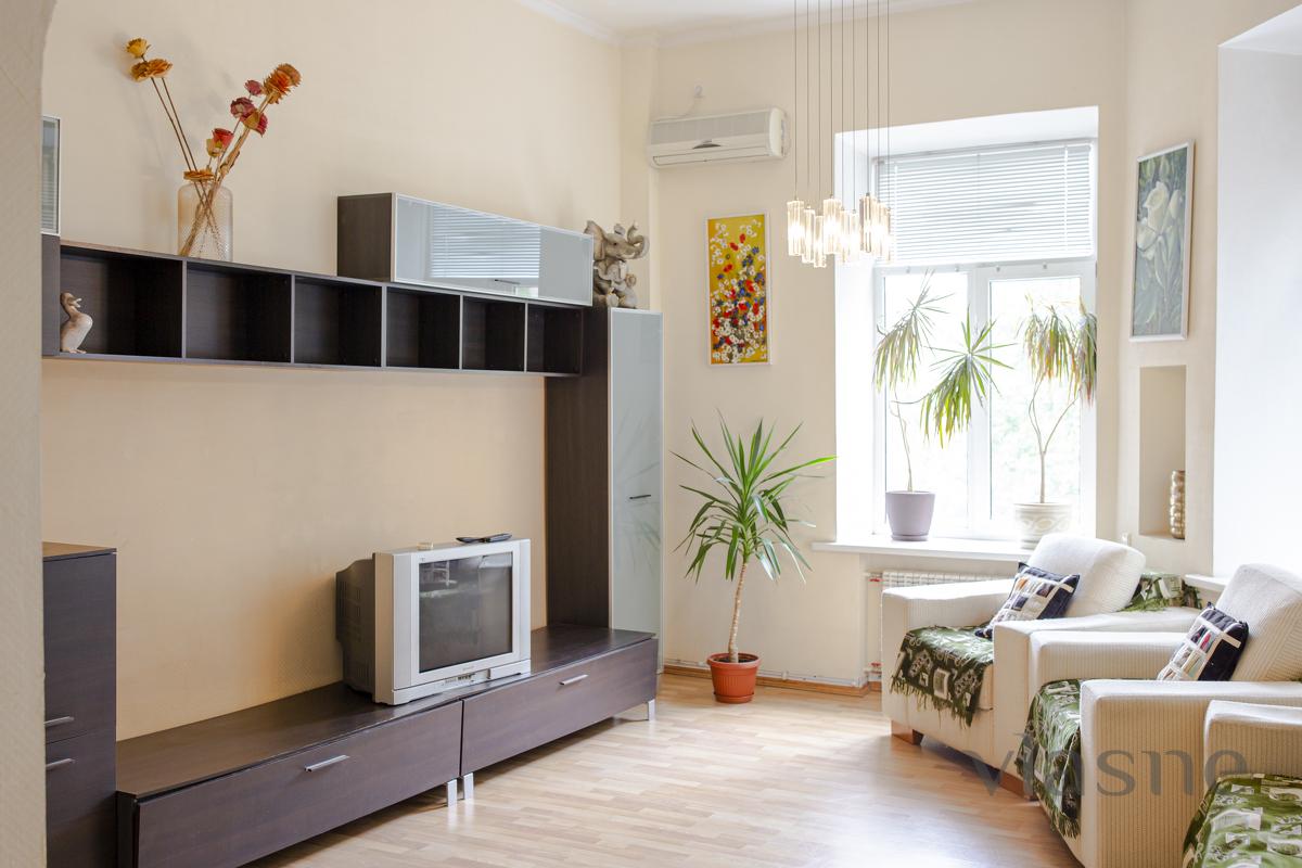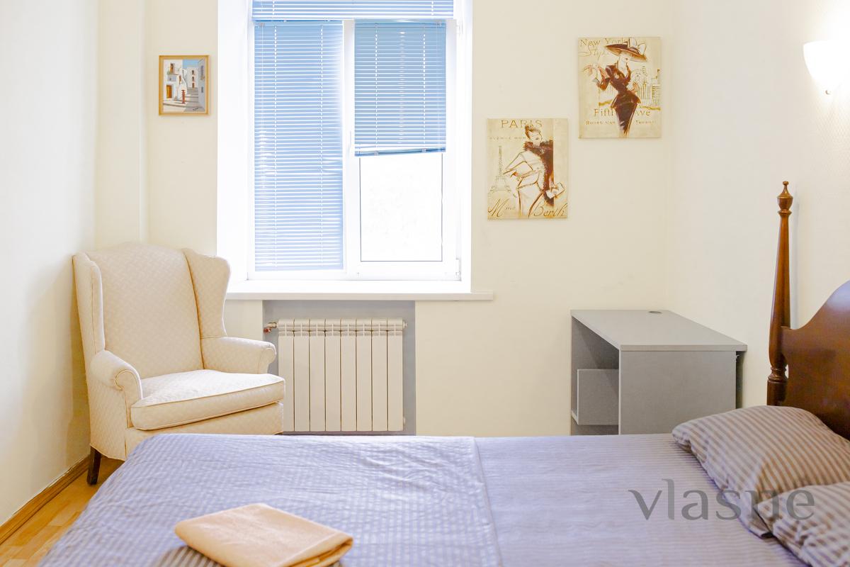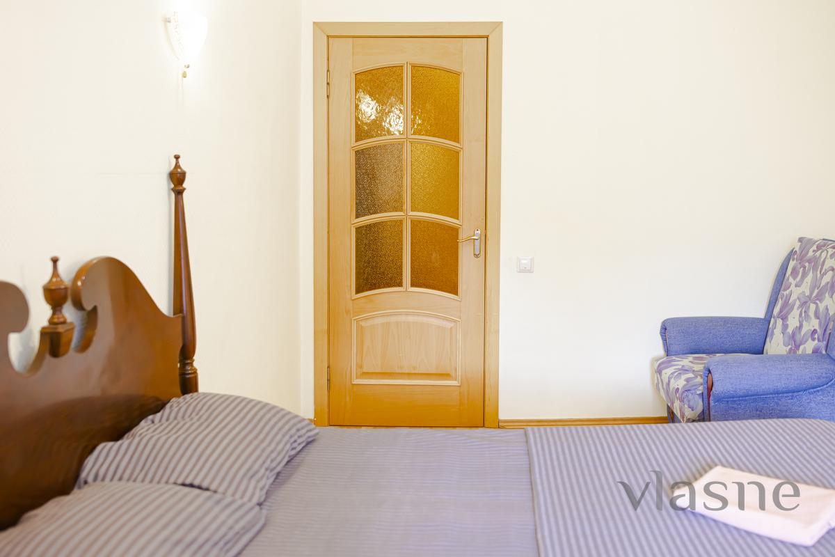 The living room and kitchen are joined by an arch. The kitchen is small, but the place is quiet, painted in a sandy shade. In the middle of the placement there is a kitchen set in a dark chocolate color, a cookware in a color set and a living table with side chairs. Є all the necessary household appliances for a comfortable stay: electric kettle, refrigerator, stove, range hood, oven and microwave oven. The first bedroom is decorated in light colors, which are very refreshing. In the middle there is all the necessary furniture for the reception area: a double bed with an orthopedic mattress, bedside tables, a large wardrobe with mirrors and a dressing table. The other bedroom is also decorated in light colors. And all the necessary furniture for a quiet rest: a double bed with a comfortable mattress, a soft chair for relaxation, and another chair that can be folded out. For a comfortable stay, the apartment has a TV, WI-FI and air conditioning. Bathroom and room with a cream color. The bathroom has a shower cabin, a bedside table, a hanging mirror with small shelves, a washing machine and a hairdryer. Availability of renting an apartment on the weekend - check the phone number!
