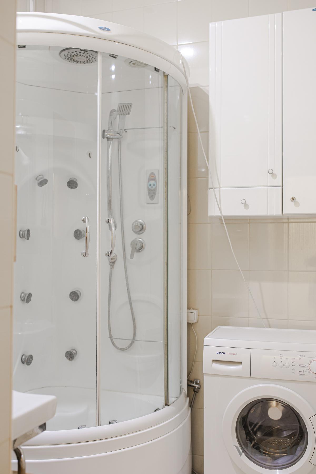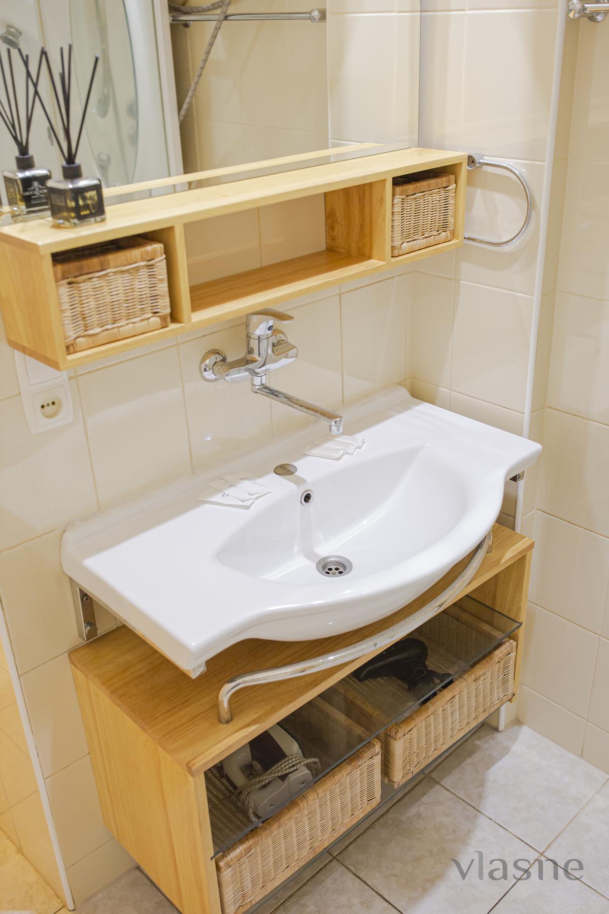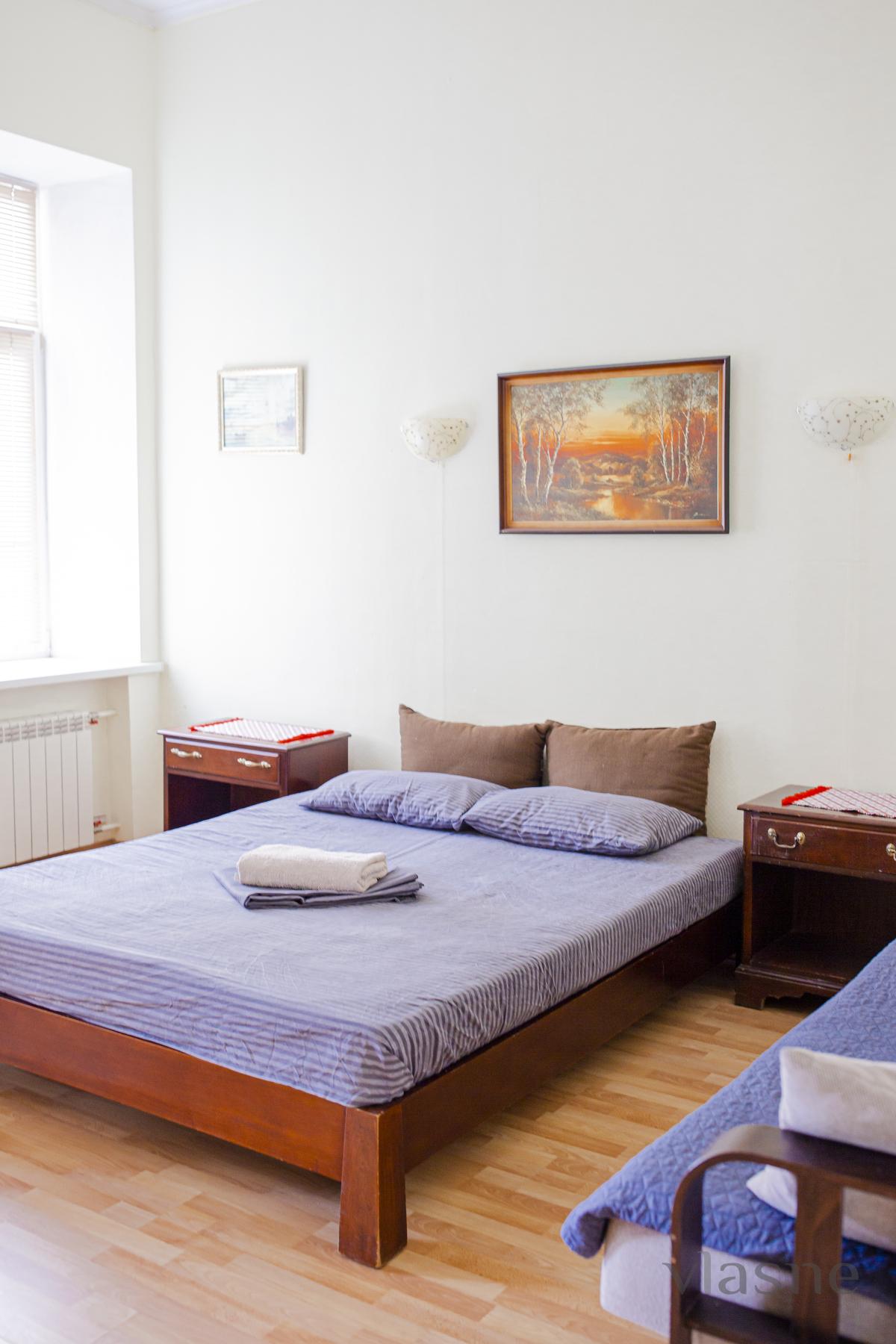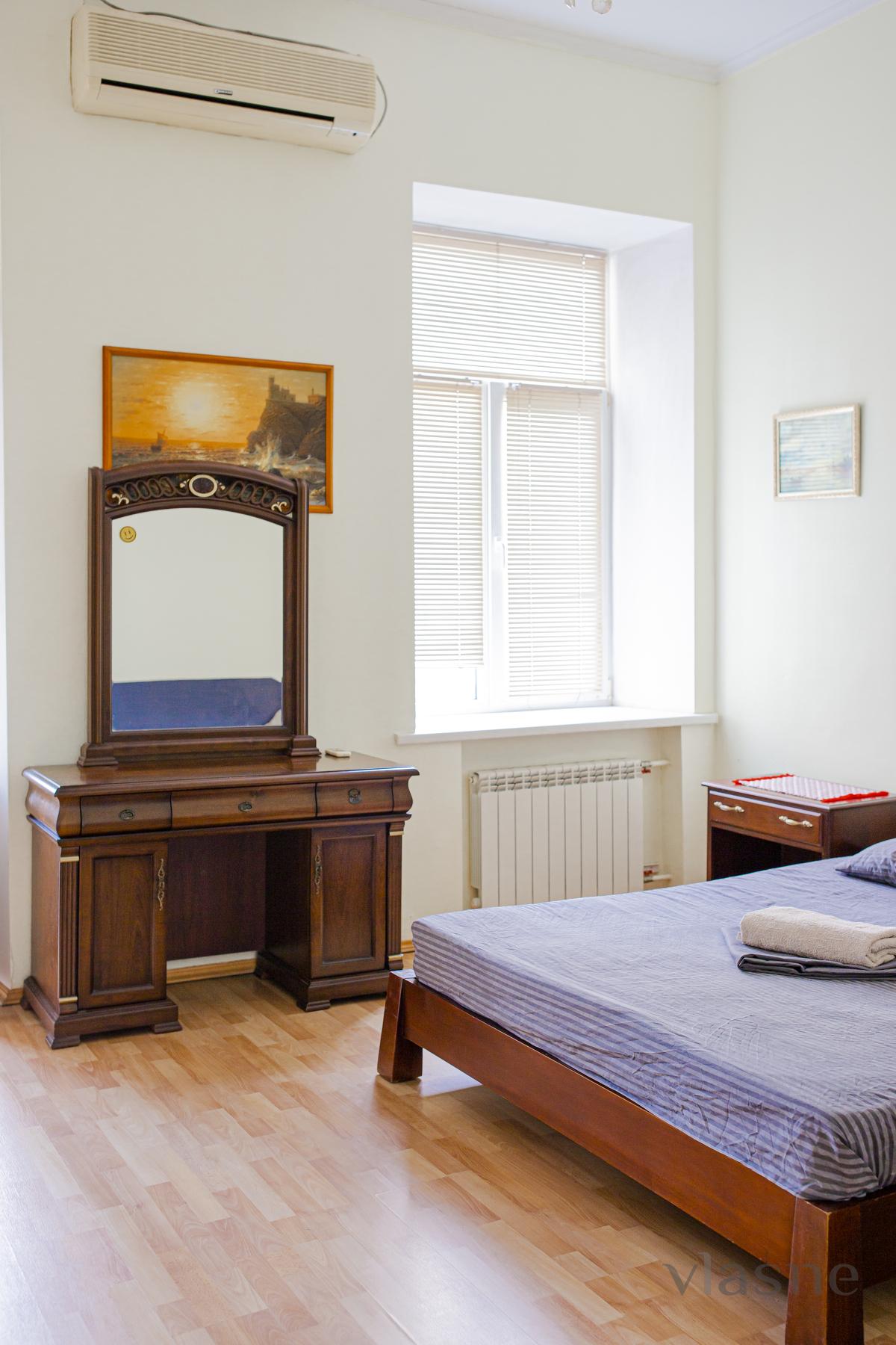 The living room and kitchen are joined by an arch. The kitchen is small, but the place is quiet, painted in a sandy shade. In the middle of the placement there is a kitchen set in a dark chocolate color, a cookware in a color set and a living table with side chairs. Є all the necessary household appliances for a comfortable stay: electric kettle, refrigerator, stove, range hood, oven and microwave oven. The first bedroom is decorated in light colors, which are very refreshing. In the middle there is all the necessary furniture for the reception area: a double bed with an orthopedic mattress, bedside tables, a large wardrobe with mirrors and a dressing table. The other bedroom is also decorated in light colors. And all the necessary furniture for a quiet rest: a double bed with a comfortable mattress, a soft chair for relaxation, and another chair that can be folded out. For a comfortable stay, the apartment has a TV, WI-FI and air conditioning. Bathroom and room with a cream color. The bathroom has a shower cabin, a bedside table, a hanging mirror with small shelves, a washing machine and a hairdryer. Availability of renting an apartment on the weekend - check the phone number!