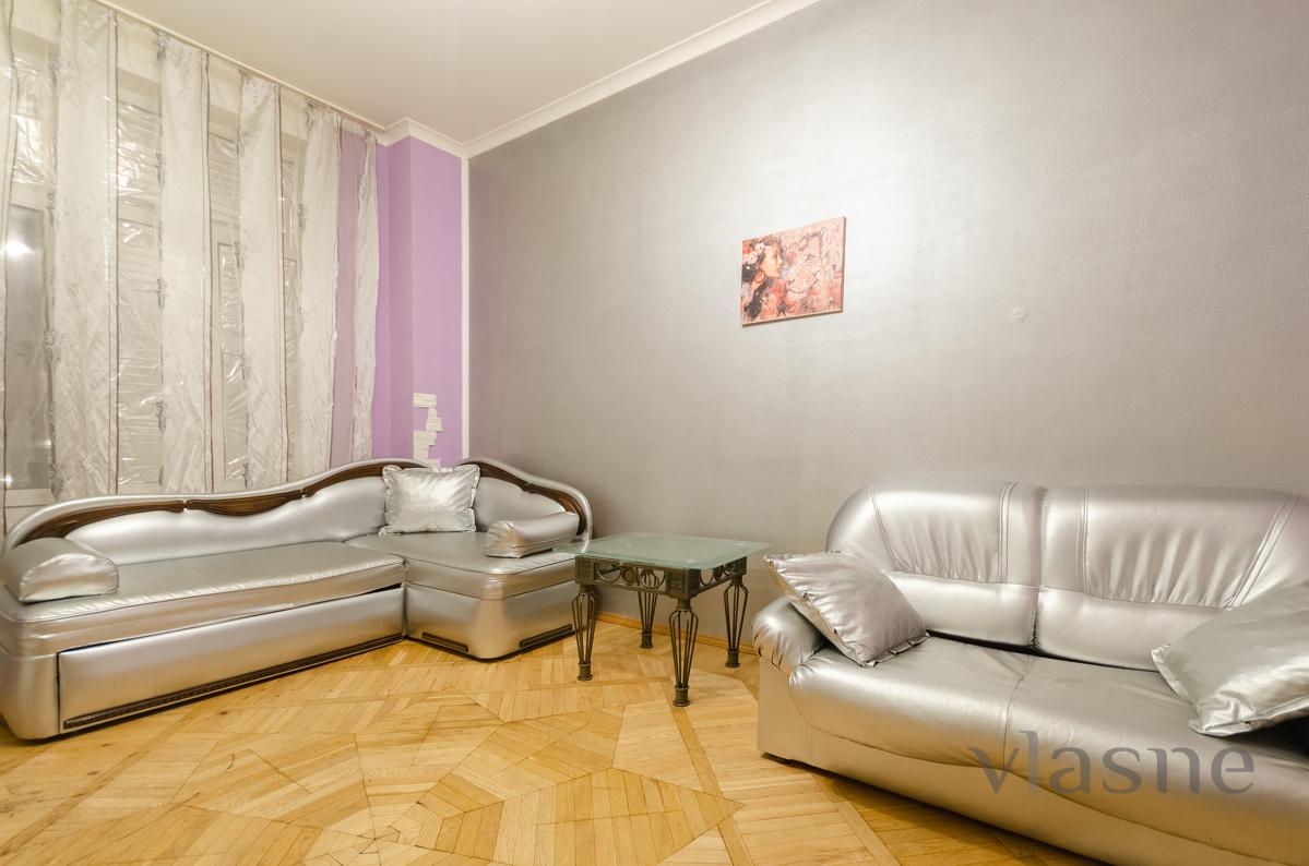 The three-room apartment is located in the center of Kiev at the address: st. Khreshchatyk 21 is a 2-minute walk to the Khreshchatyk metro station and an 8-minute walk from the Maidan Nezalezhnosti metro station. The following are readily available: restaurants, cafes, coffee shops, clothing and equipment stores, the TSUM shopping center and the Globus shopping center.