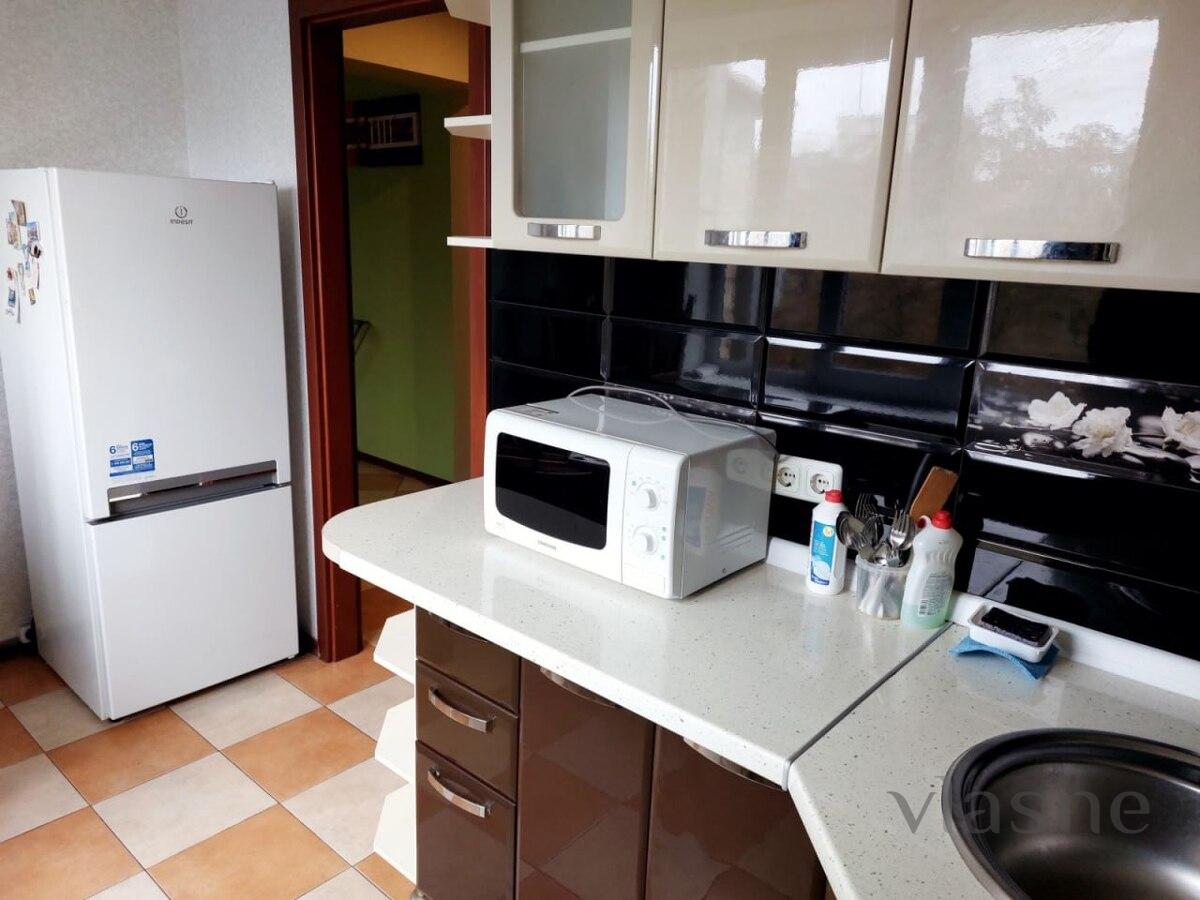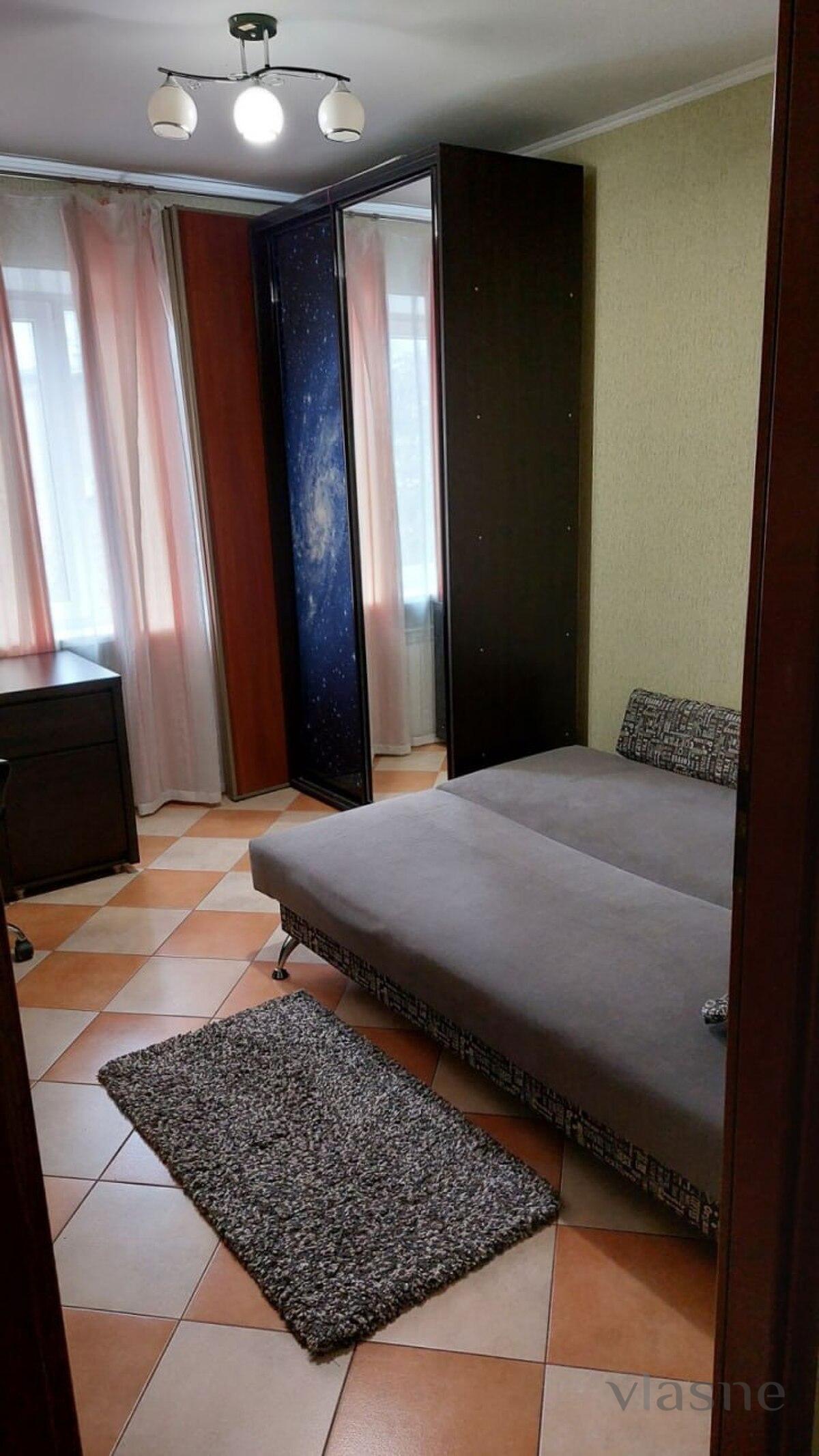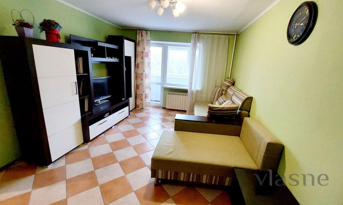 The apartment is decorated in light colors, spacious in the middle with divisions into 2 bedrooms, a living room, a kitchen and a bathroom. The living room is decorated in a light green color; at the end of the room there is an exit to a balcony overlooking the place. And all the necessary furniture and equipment for a reception: a sofa (folding), a small sofa, a wall of furniture in dark wood with white-colored details and a TV installed. The two bedrooms are decorated in a light beige color and contain all the necessary furniture for a comfortable finish, rather than being destroyed on the furniture surface. The first bedroom contains: a double bed with an orthopedic mattress, a stand with shelves, a wardrobe with many drawers and a mirror. In the other bedroom there is a double fold-out sofa, a work desk with a side table, a wardrobe with a mirror and an open wardrobe with shelves. The kitchen is small, quiet, painted in a light sand color. The kitchen set is decorated in cream and brown colors. Obviously, there are all household appliances and furniture: refrigerator, stove, oven, range hood, microwave oven, kettle and living room table with cupboards. The bathroom is decorated in white and black colors. In the middle there are: a bathtub, a washroom, a sink with a cabinet, a mirror, a washing machine and a hairdryer. Fresh, white clothes and clean towels are prepared in advance. Availability of renting an apartment on weekends - check the number.