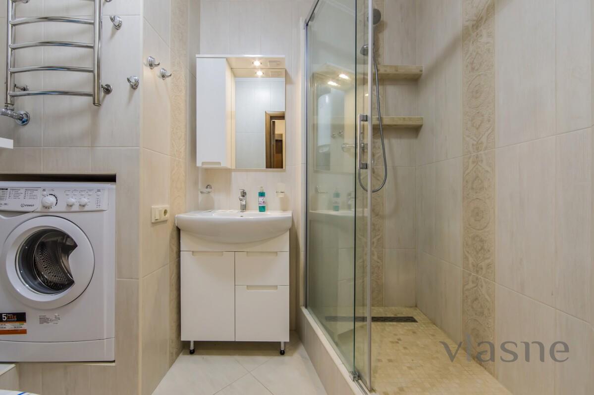 Санвузол суміщений із душовою кабіною, у ньому є умивальник із дзеркалом, тумбочка та пральна машина.