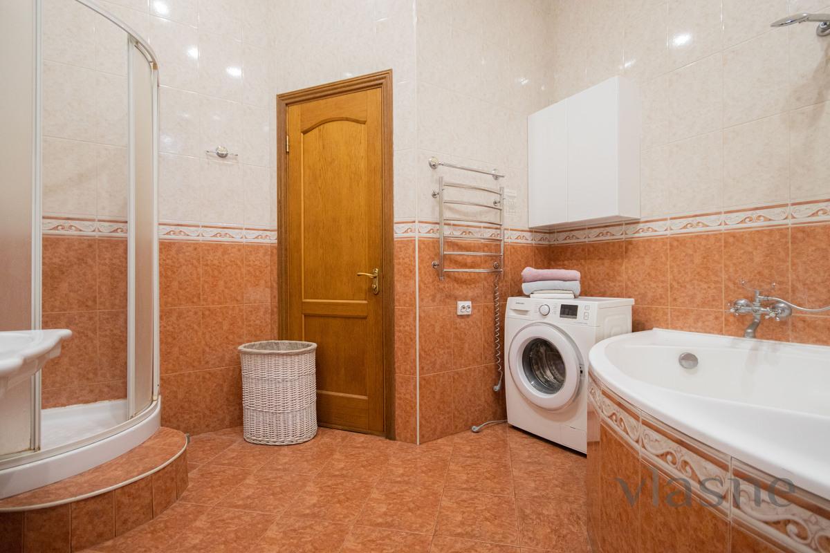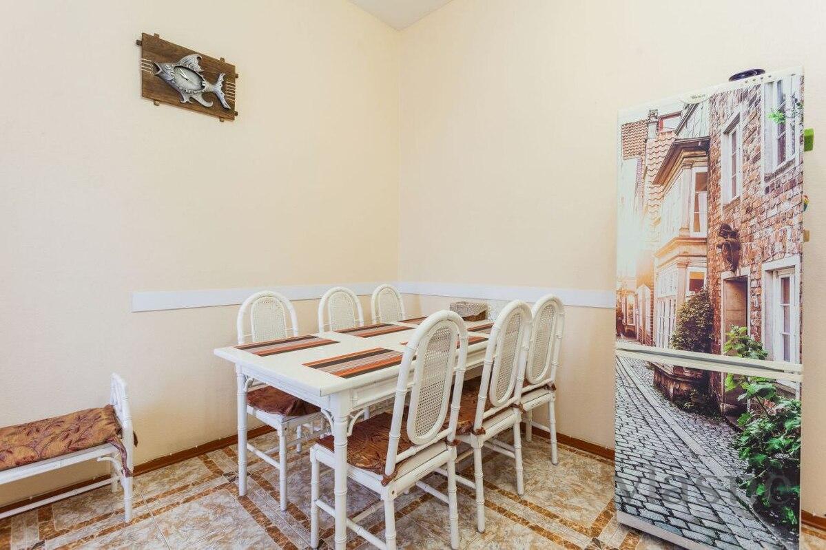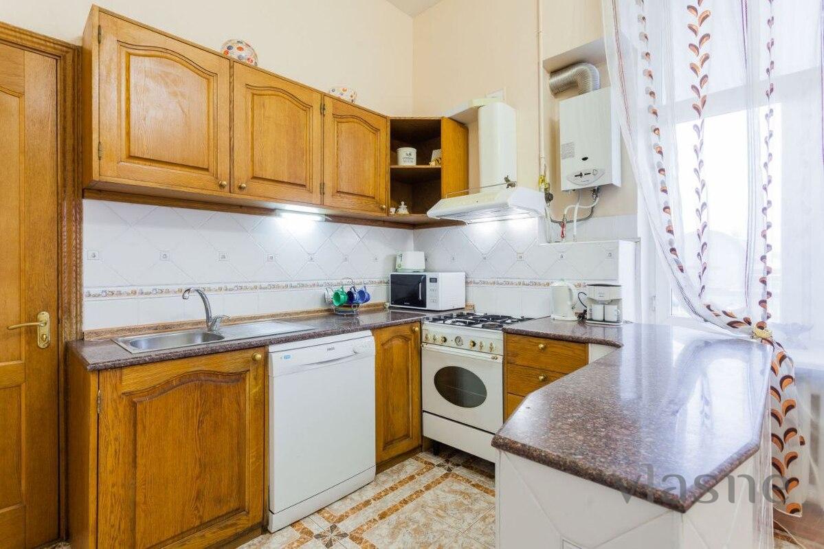 Кухня кремового кольору, має дерев'яний меблевий гарнітур, з робочою поверхнею та вбудованою раковиною. Також є уся необхідна побутова техніка для комфортного проживання: холодильник, плита, духовка, витяжка, посудомийка, мікрохвильова піч і чайник. В іншій частині розміщено білий обідній стіл зі стільцями.