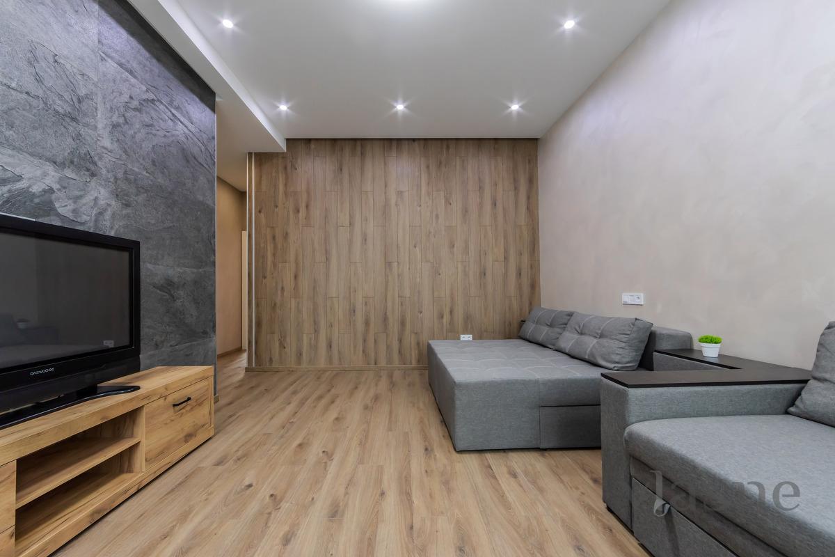 Вітальня облаштована диваном та кріслом, а також журнальним столиком, комодом та настінним плазмовим телевізором.