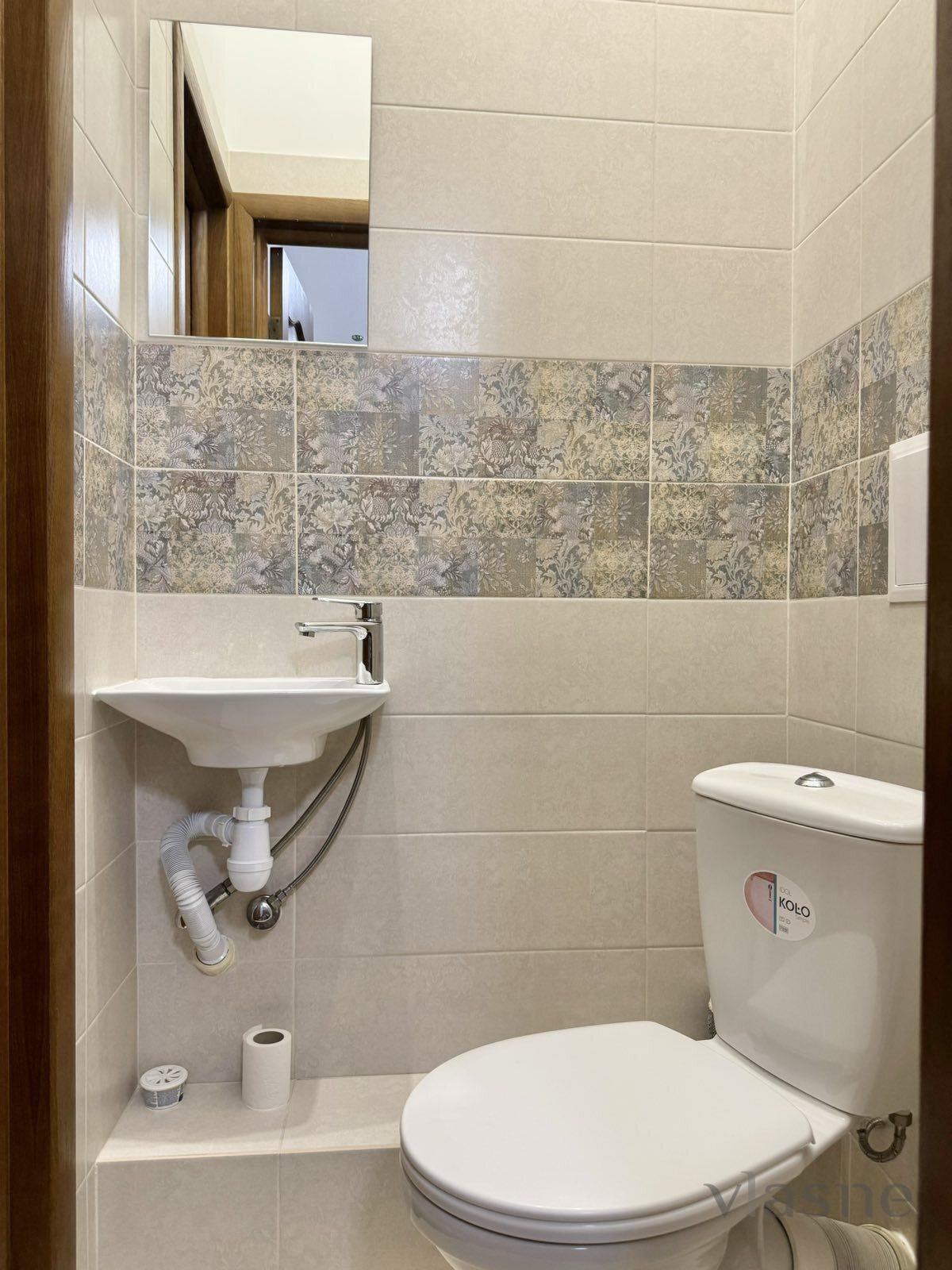 Вбиральня поєднана з душовою кабіною, є умивальник із дзеркалом.