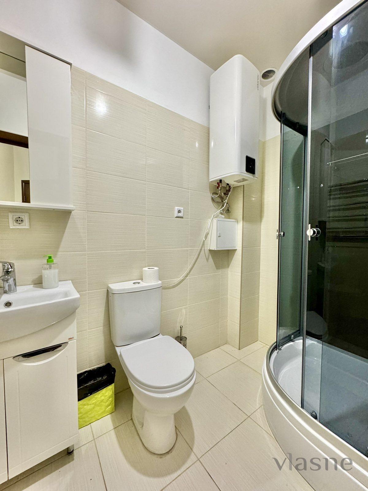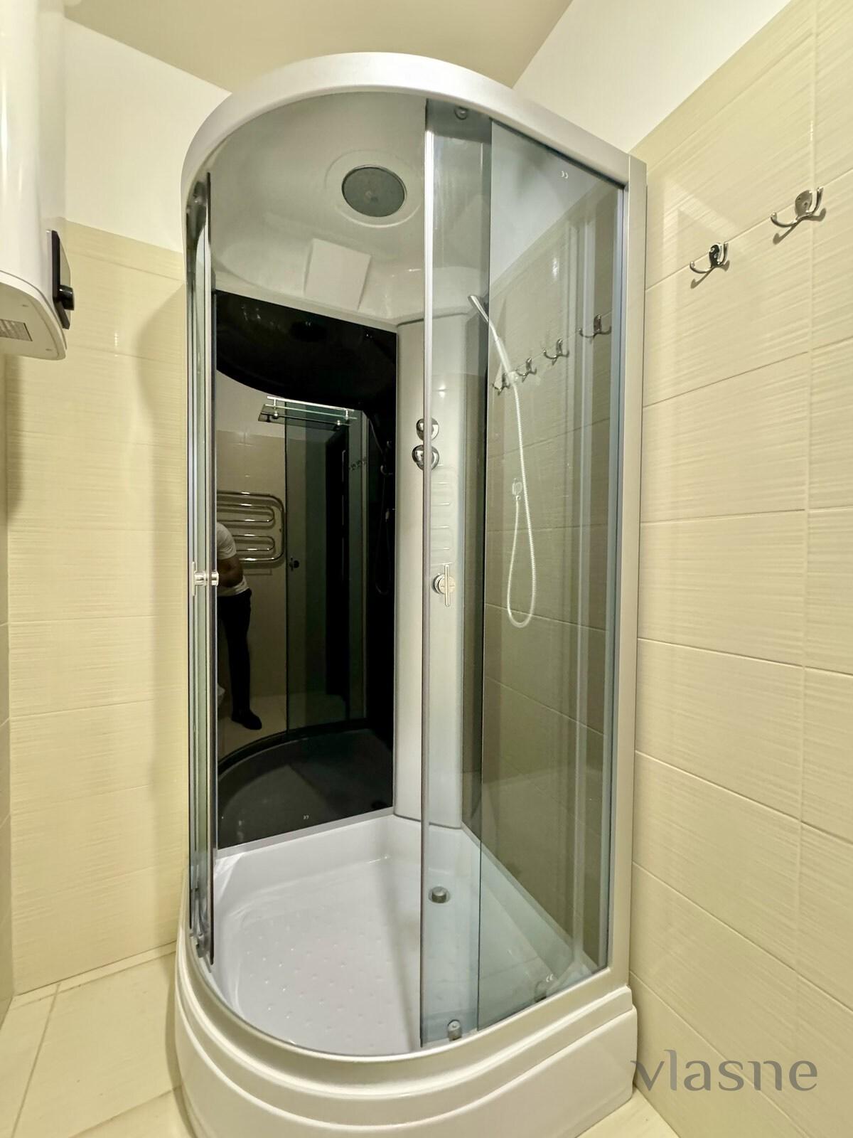 Вбиральня поєднана з душовою кабіною, крім того тут знаходиться: умивальник із дзеркалом, бойлер та пральна машина.