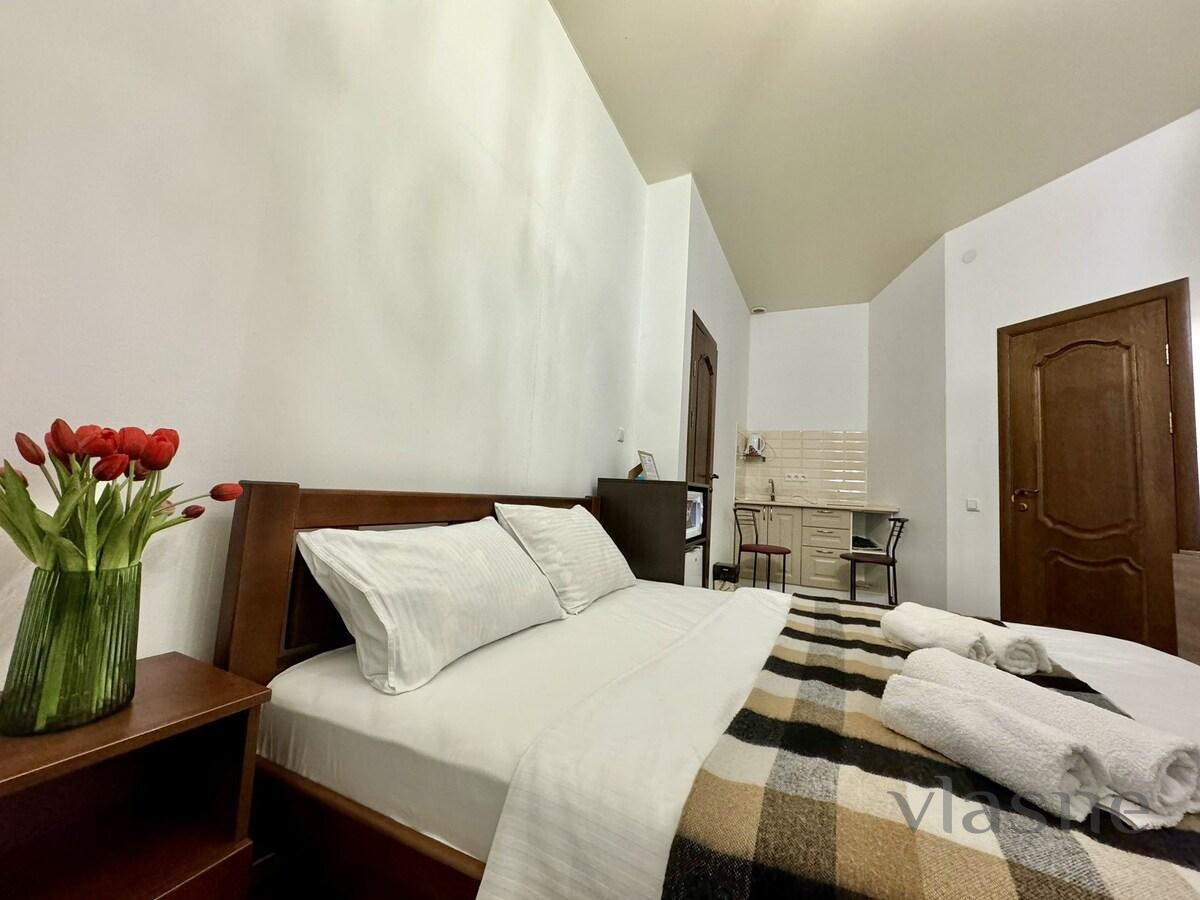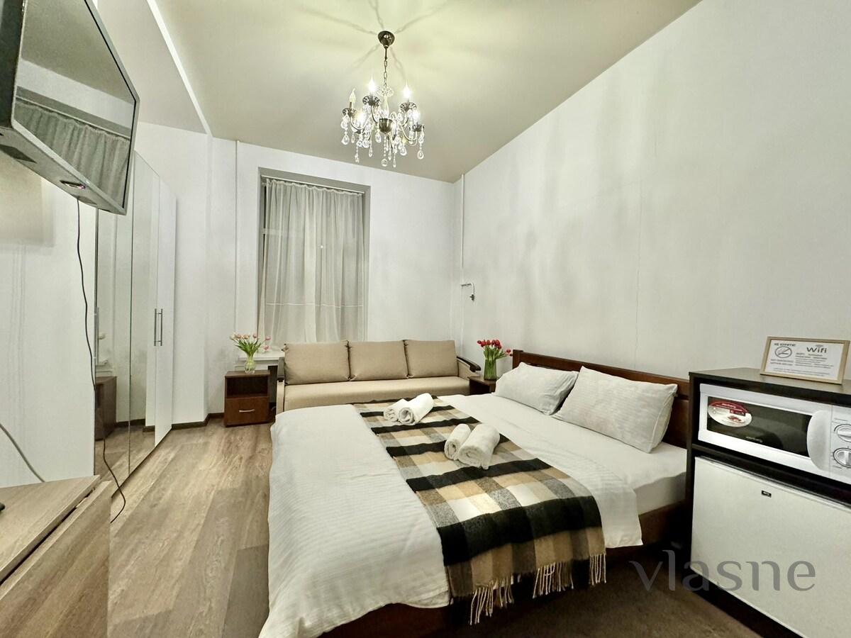 У зоні спальні надані всі необхідні меблі та техніка для комфортного відпочинку: двоспальне ліжко з ортопедичним матрацом, зручний диван, журнальний столик з кріслами і тумба з телевізором.