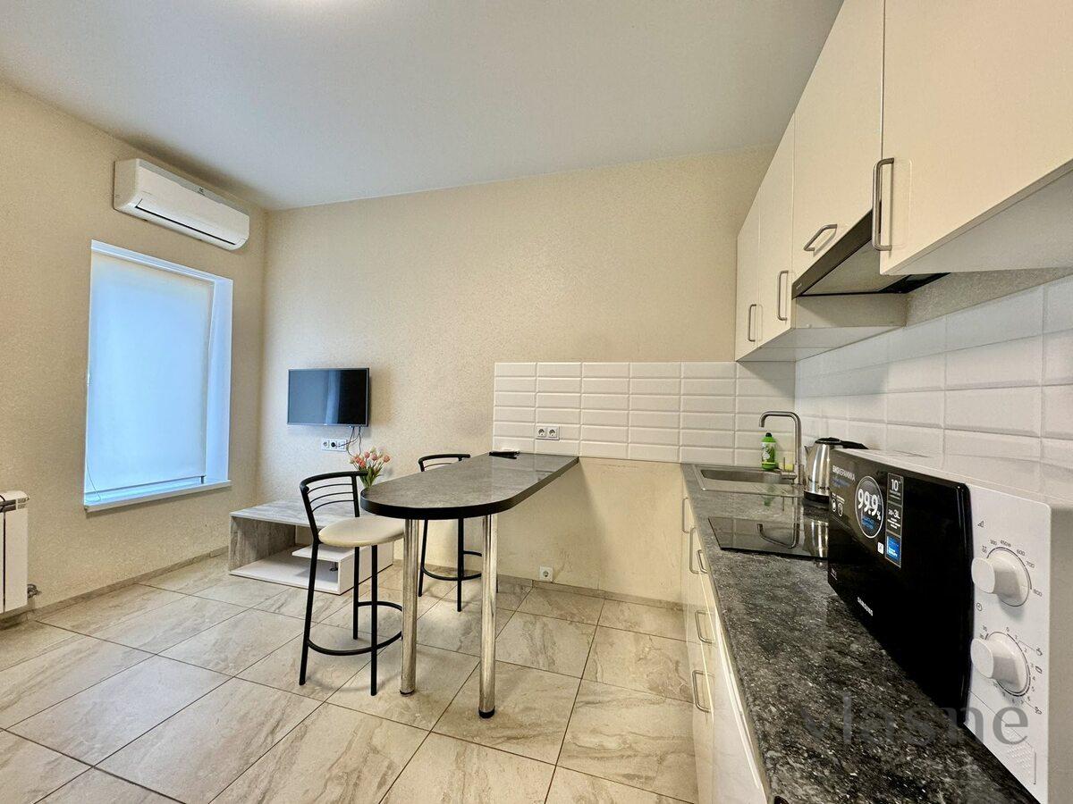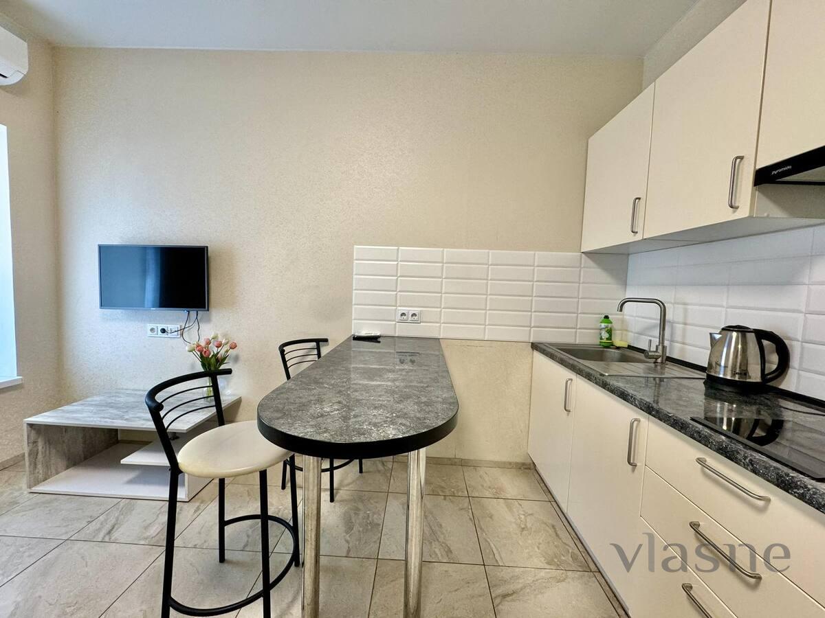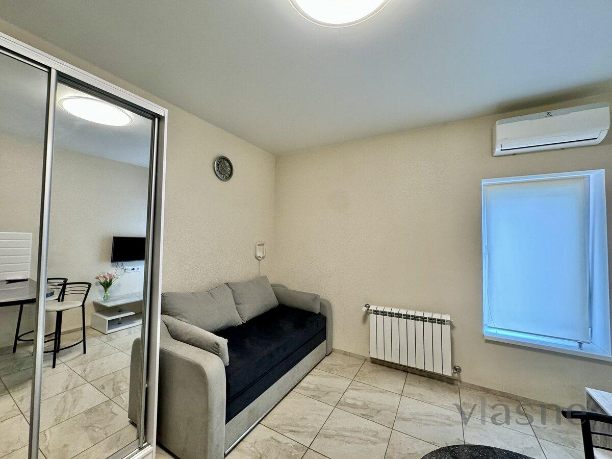 Квартира-студія з сучасним ремонтом, виконана у світлих тонах з кольоровими акцентами та комфортними меблями.