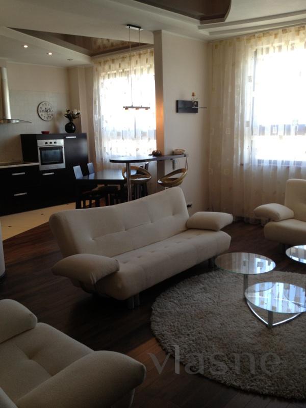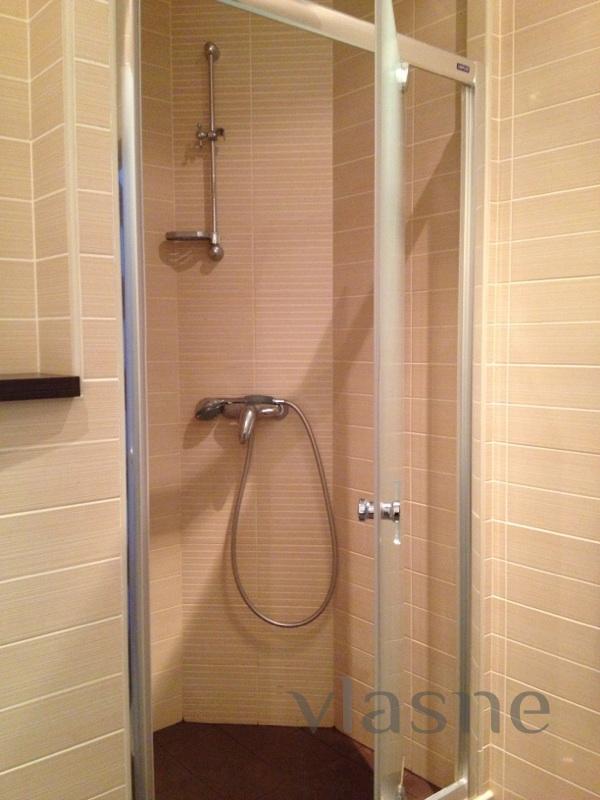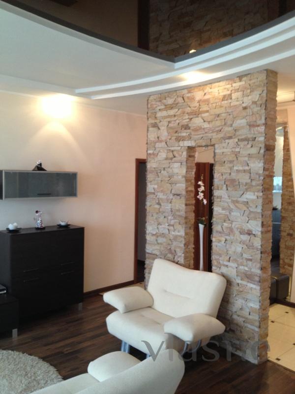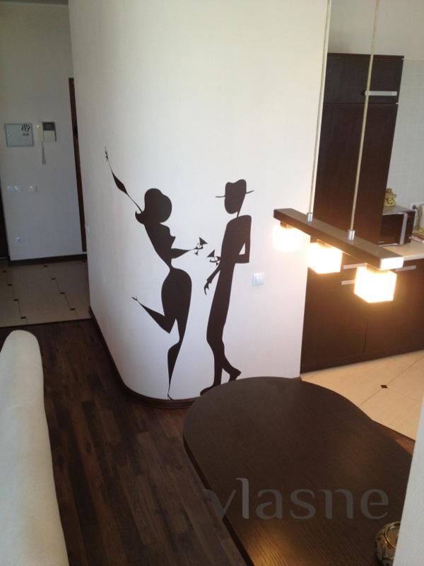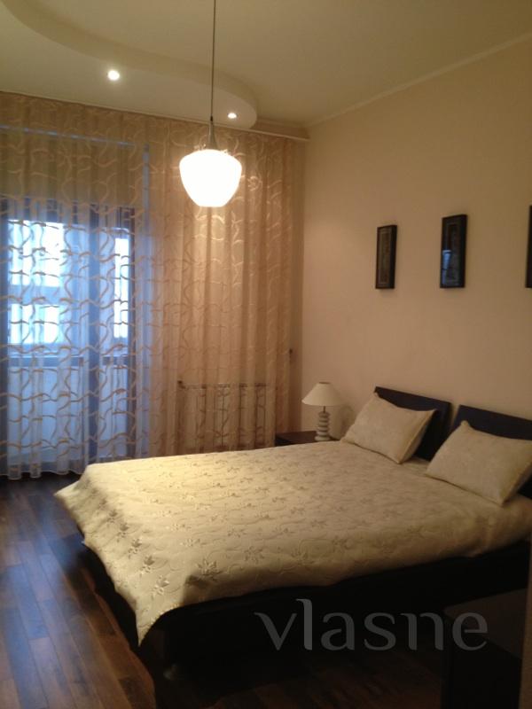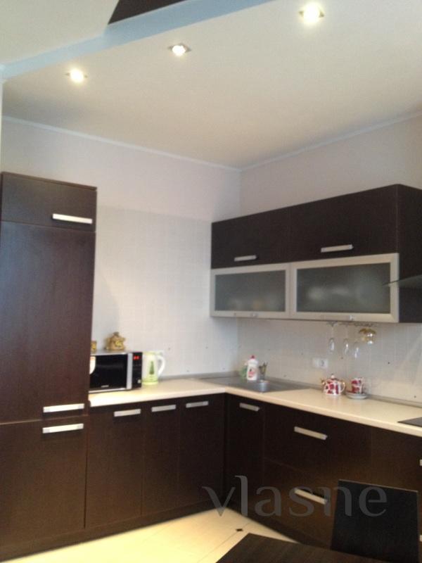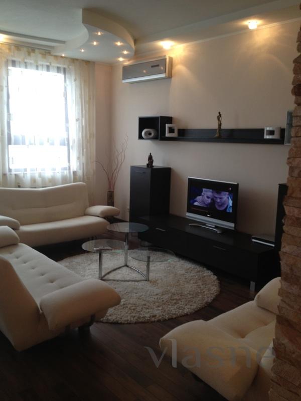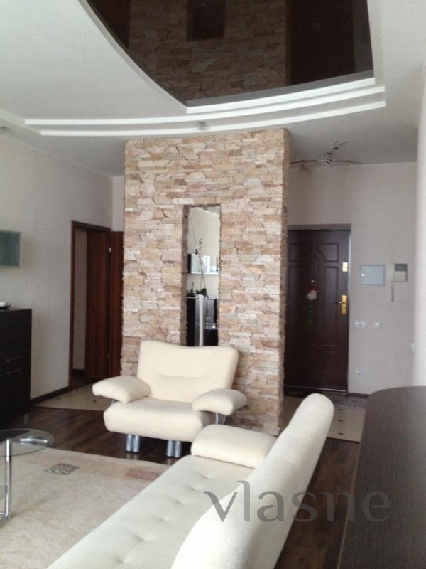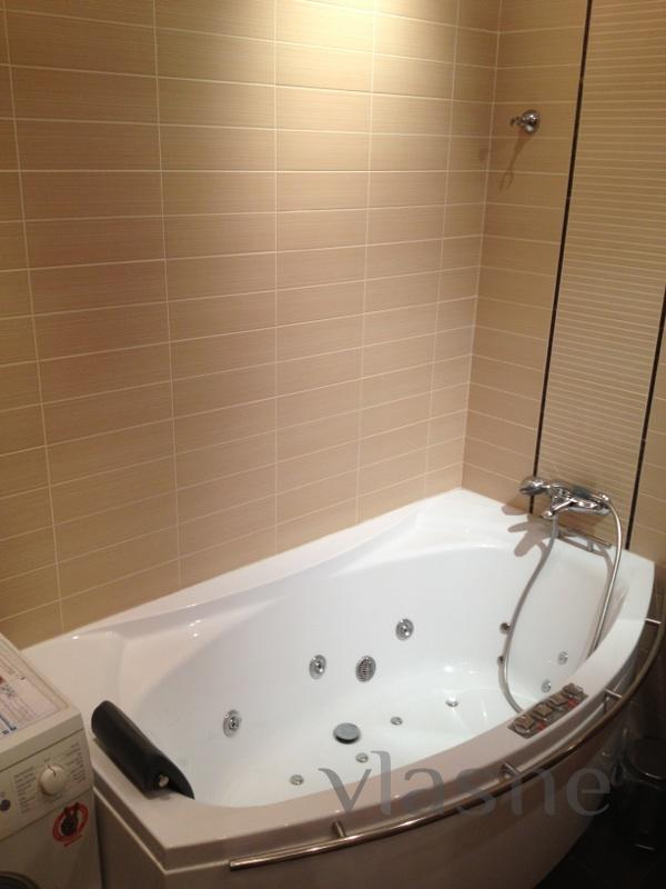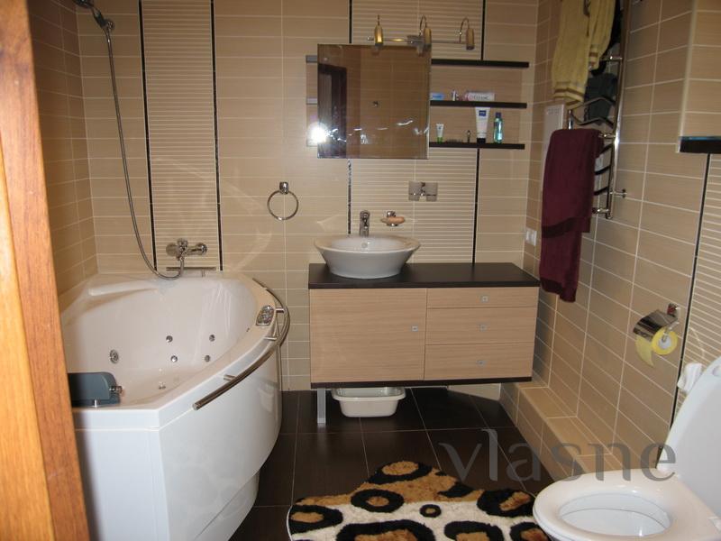 I rent a 2-studio apartment KIEV CENTER, LUX Rustaveli St. 44.S = 75m sq, 13 floor20et (new house) Apartment with designer renovation (modern style): furniture, kitchen-studio with built-in household appliances, air conditioning, su: bath Jacuzzi, shower, heated floor (su, corridor), multi-level stretch ceilings, the walls are decorated natur.