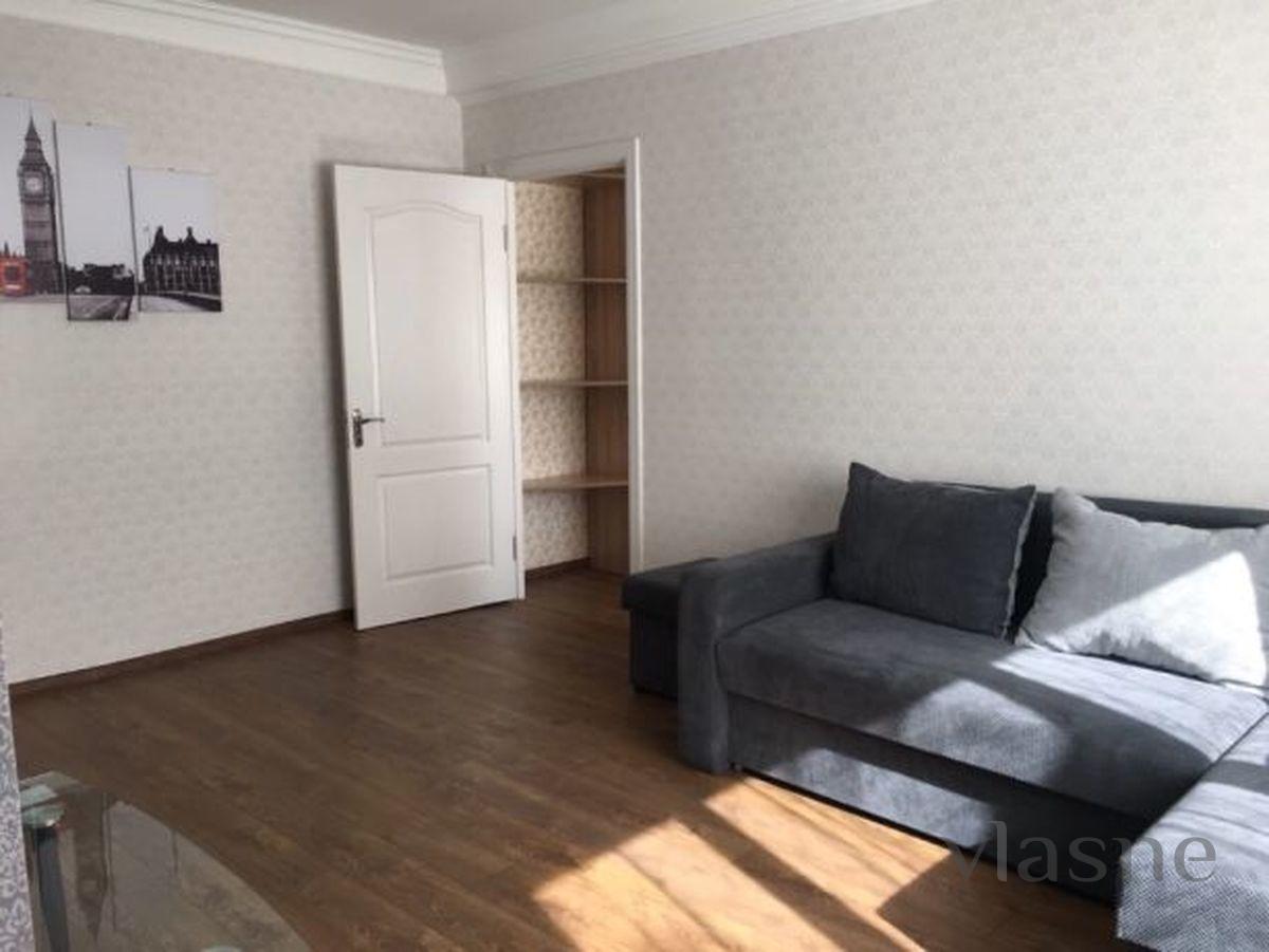 В гостиной новый мягкий уголок с большим спальным местом. Квартира укомплектована бытовой техникой( встроенная кухня,варочная поверхность )В гостиной расположен кондиционер и LCD TV с кабельным ТВ, высокоскоростной WI-FI интернет со скоростью 100мб/с.